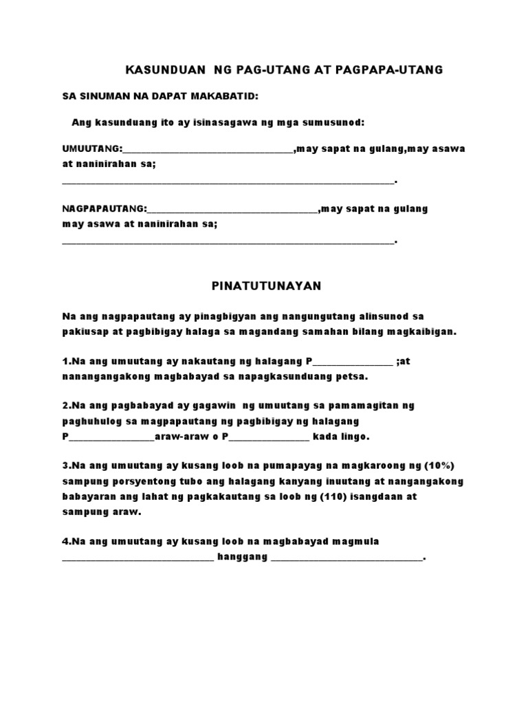 Kasunduan Template Doc Template Pdffiller from www.pdffiller.com Ang pokus dito ay ang manunulat mismo. Halina't basahin at gawing inspirasyon sa iyong paksang napili ang mga talumpating nakalap namin. Isang halimbawa ng kanyang pakikipaglaro… nang si 'aishah (y), ang ina ng mga mananampalataya, ay nagsalaysay: Magtala ng limang hakbang na gagawin mo upang maipakita ang pagiging tapat sa iyong pangako at hindi mawala ang tiwala sa iyo ng iyong kapwa. #bugtongbugtong #bugtongatsagot #halimbawangbugtong #bugtongbugtongtagalogmaysagot #bugtongbugtongtagalogmaysagothardhi and welcome to elearning ph. Contextual translation of halimbawa ng kasunduan sa bilihan ng kotse into english. Eloisa galasi,may sapat na gulang,may asawa at naninirahan sa barangay dicabasan, dilasag, aurora. .naglalaman ng aktuwal na mga halimbawa ng lahat ng kp forms na ginagamit sa proseso ng kp.